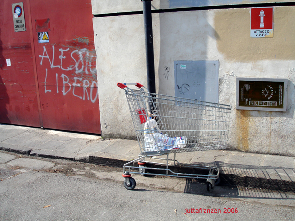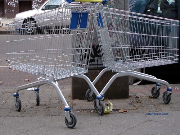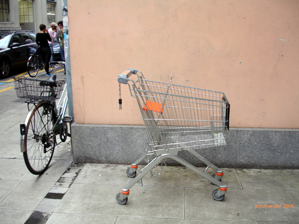 1937 erfand Silvan Goldman in Oklahoma City den Einkaufswagen, demit die Kundschaft in seinem Supermarkt mehr einkaufen konnte. Ist das mehr als man nach Hause tragen kann, so wird oft der Einkaufswagen für den Transport mitgenommen und dann zurück gelassen. Selten wird der Einkaufswagen erneut für weitere Wege genutzt; er scheint vielmehr seine Mobilität zu verlieren und fügt sich, einer Skulptur gleich, ins urbane Straßenbild.
