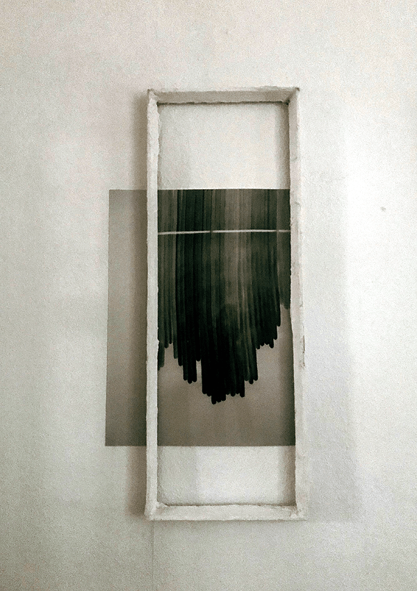 Zehn Jahre später, 2016 stoße ich wieder auf die Fotodatei (Layer 1) und lasse einen Druck (Layer 2) erstellen. Er bekommt einen Rahmen, der das Foto in Breite der horizontalen Lichtlinie und entlang der linken vertikalen Linien eingrenzt, die den ursprünglichen Rahmen im Foto darstellen. Nach oben und unten überragt der Rahmen den Druck, zur linken Seite entweicht das Foto der Rahmung.
